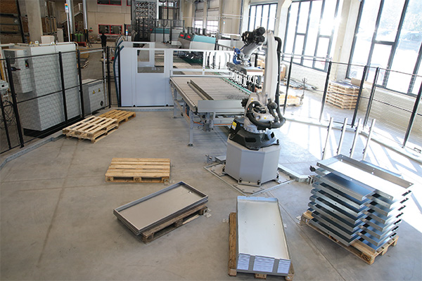 Based on Salvagnini‘s MD sheet metal store-tower, the S4 punching machine is fed automatically with single sheets from the rows of trays. Thanks to the multi-press punching head in combination with the angle shears, parts are individually punched and quickly transferred further within the line. Subsequently, the MCU device brought the parts into the correct position for the P4 panel bender and transferred to it. After bending, the robot takes the part and stacks it on one of the unloading pallets. - The outcome