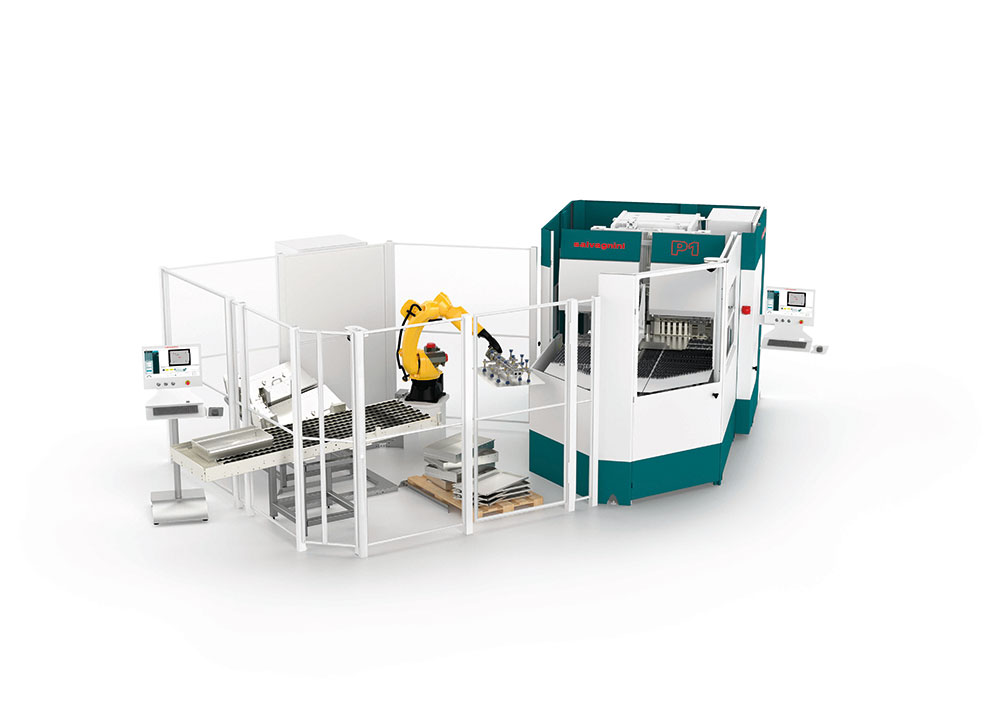 P-Robot combine une Panneauteuse Salvagnini et un robot pour produire des kits, des lots et des pièces individuelles de manière autonome.