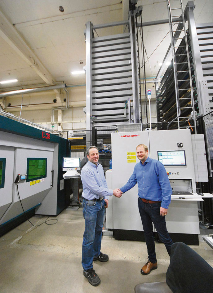 Marchesini replaced the CO2 laser with a 4 kW Salvagnini L3 fiber laser integrated with the existing automated store via a customized ADLU device. ADLU automatically returns leftovers to the store; its independent suction cups handle irregular shapes, while Marchesini’s existing software recognizes them and drives picking. APC2 optimizes piercing and auto-restarts; NVS checks beam centering and nozzle status; ACUT enables treated compressed-air cutting.